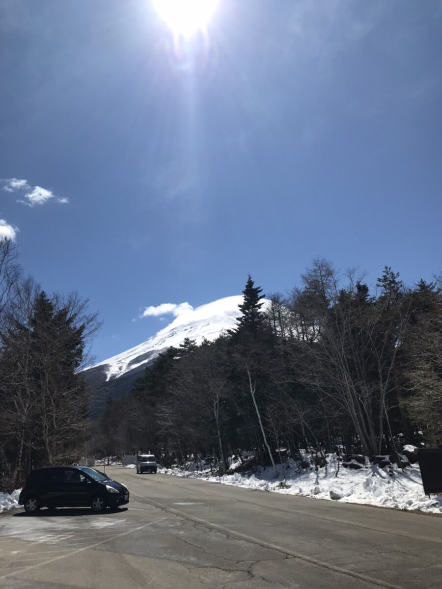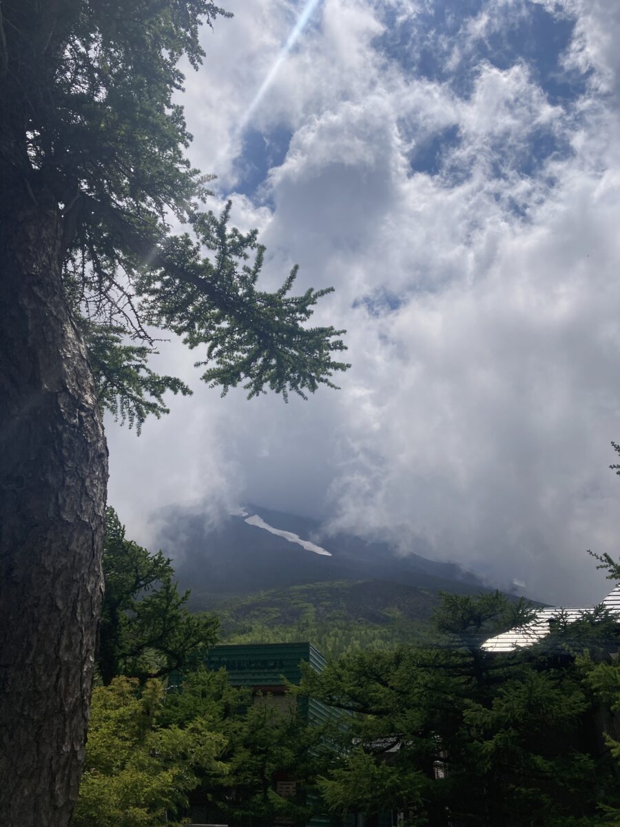 スバルラインからの景色は森林に囲まれてまっすぐに続く道を進むと下界では味わえない世界です。 当日は雲が多く、富士山見れるかな?という感じでしたが、五合目に着くと雲が切れて、写真で撮ったよりも山頂を見ることが出来ました。長袖を来てないと寒いくらいでした。