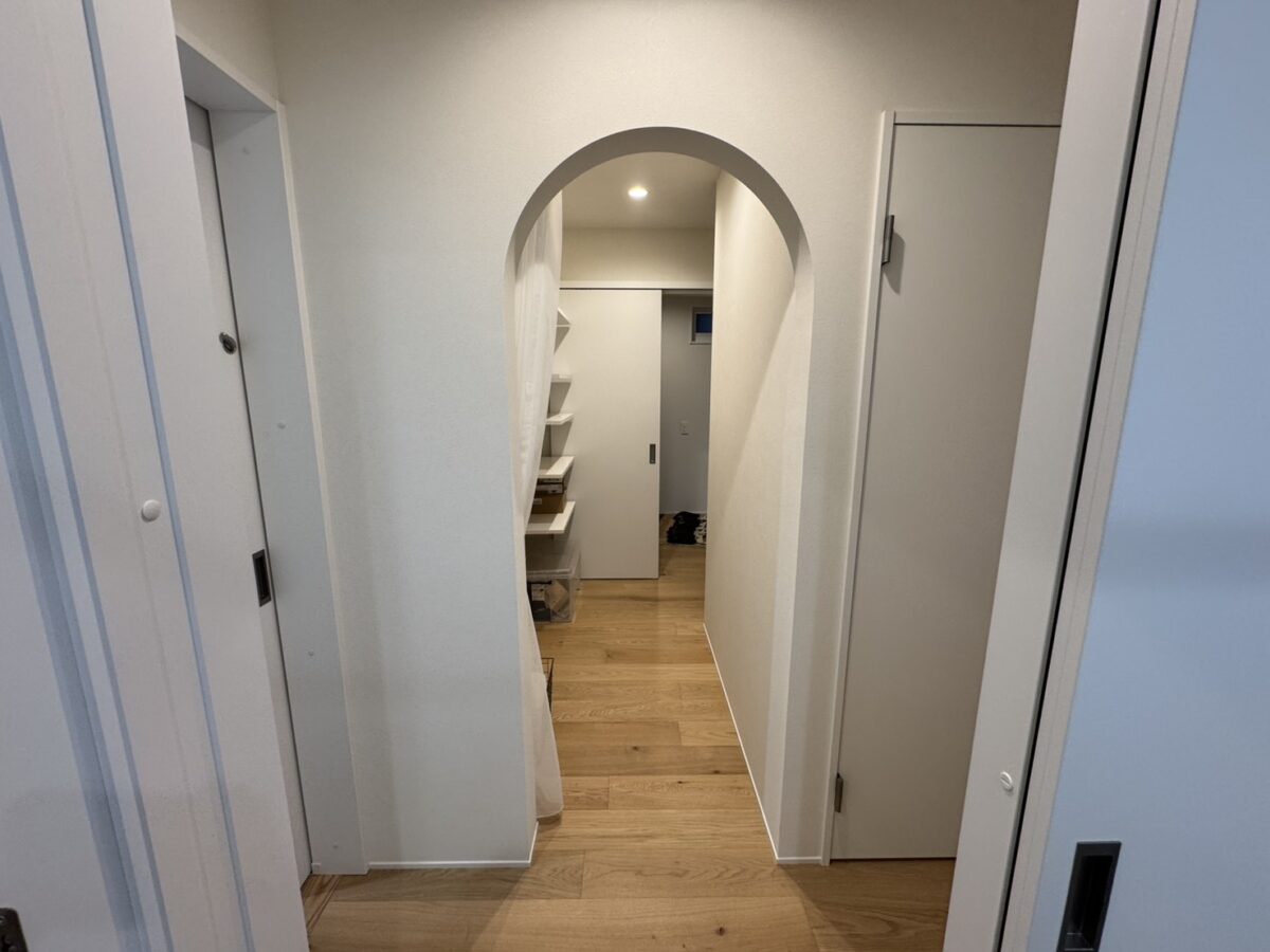 玄関からファミクロを通って洗面所へ抜けられる回遊動線や、キッチンから洗面ランドリーにつながる家事動線など