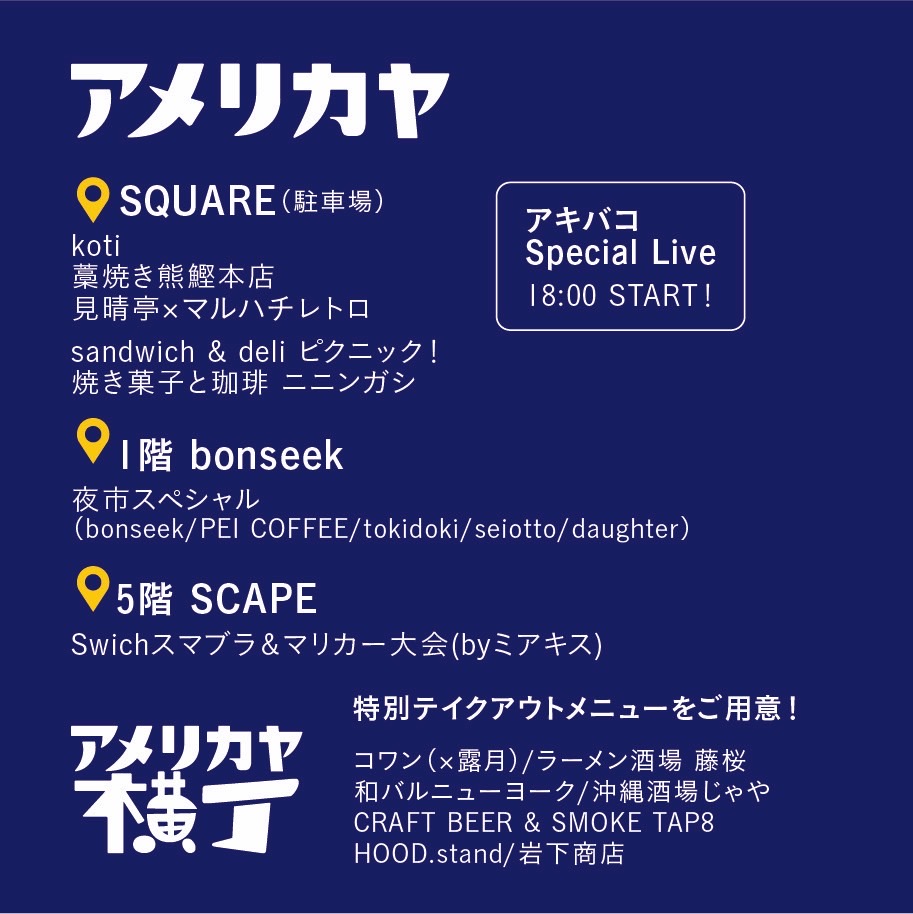 アメリカヤ駐車場では各出店者さんの屋台やアキバコさんによるライブコンサートで賑わい、アメリカヤビル内、横丁各店舗もこの日一夜限りの特別メニューなどで皆さんがそれぞれに楽しめていただけたのではないでしょうか。